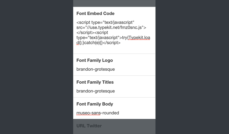 They’re pretty self-explanatory – paste in the embed code provided by your font service (remember to make sure you’ve set it up to allow your blog domain and fonts), then you can add the font name for the Body font, Logo font, and Titles fonts (includes Quote and Link post types).