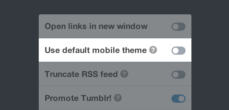 Don’t forget, all of our themes are 100% responsive, so they look great on any screen size – from phone to cinema display. By default, Tumblr uses it’s own default ‘mobile theme’ when you’re viewing your blog on small devices, but you can turn it off: