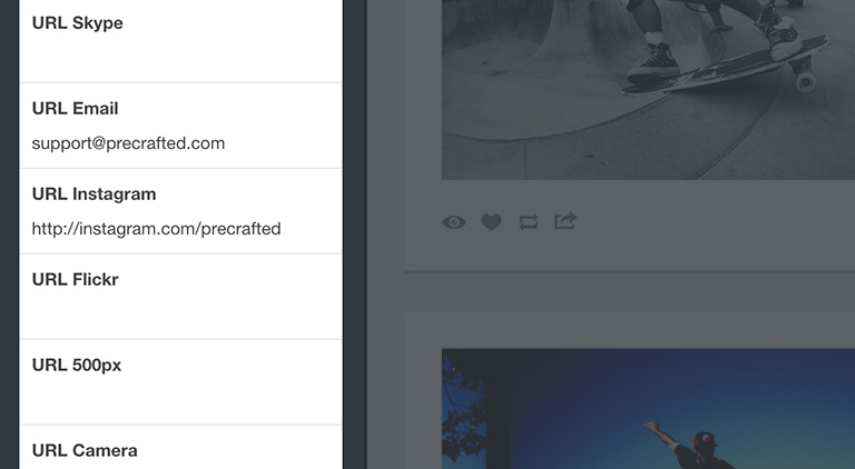 All of our themes come with support for icons to link to your social media and other web service accounts. We currently have icons for Twitter, Facebook, Tumblr, Website, Google, Linkedin, Foursquare, Skype, Email, Instagram, Flickr, 500px, VSCO Grid, Camera, Eye, Pinterest, Heart, Youtube, Vimeo, Vine, Ebay, Store, Apple, Googleplay, Etsy, Dribbble, Behance, deviantART, Github, Medium, Quora, Weibo, Travel, Lastfm, Rdio, Spotify, Soundcloud, and RSS.