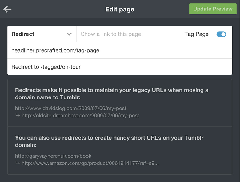 - In the “Redirect to” field, add /tagged/mytag to the end of your blog URL, but replace “mytag” with the tag you want to use. For tags with multiple words, use an underscore, plus sign, or dash in between each word (i.e., /tagged/bubble_tea, /tagged/bubble+tea, /tagged/bubble-tea).